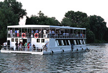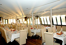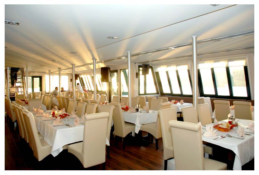 Das Schiff Mara, der Katamaran auf zwei Etagen, bietet maximale Behaglichkeit, geschäftliche Ambiente, erstklassige Bedienung, klimatisierten Salon, Restaurant-Bar, professionelles Beschallungssystem, offene Oberdeck.