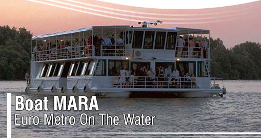 Boat Mara, catamaran with two decks, offers maximal comfort, business ambience, top service, air-conditioned room, bar restaurant, professional sound system, open upper deck.